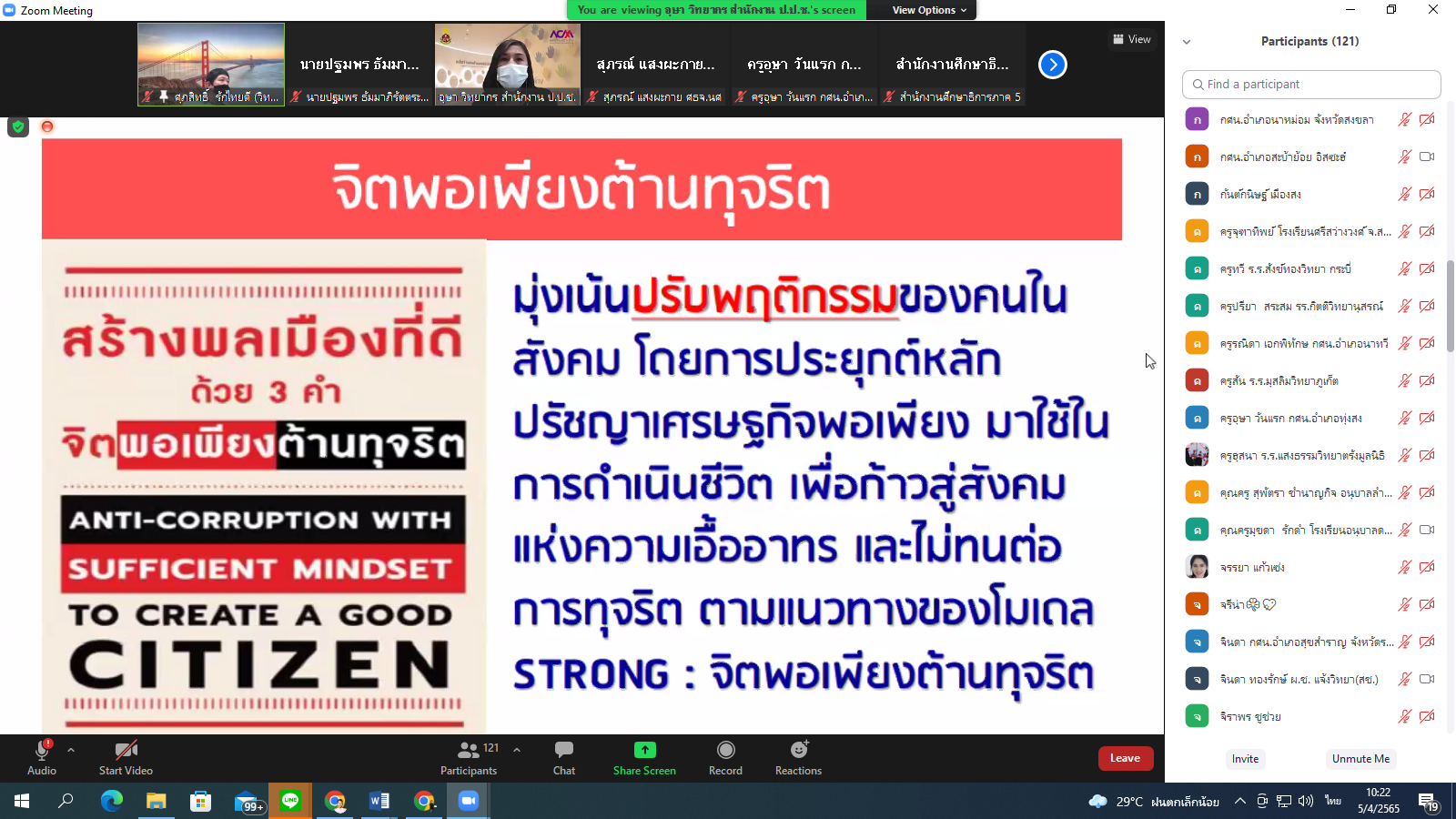 เมื่อวันที่ 4 - 5 เมษายน 2565 นายปฐมพร ธัมมาภิรัตตระกูล ข้าราชการครู กศน.อำเภอสิงหนคร ได้รับมอบหมายจากผู้อำนวยการ ให้เข้าร่วมอบรมโครงการขับเคลื่อนการปลุกจิตสำนึกต่อต้านการทุจริตด้วยหลักสูตรด้านทุจริตศึกษาของหน่วยงานทางการศึกษาในพื้นที่สำนักงานศึกษาธิการภาคใต้ ประจำปีงบประมาณ พ.ศ. 2565 ทางออนไลน์ ผ่านระบบ Zoom เพื่อสร้างความเข้าใจเกี่ยวกับหลักสูตรด้านทุจริตศึกษา